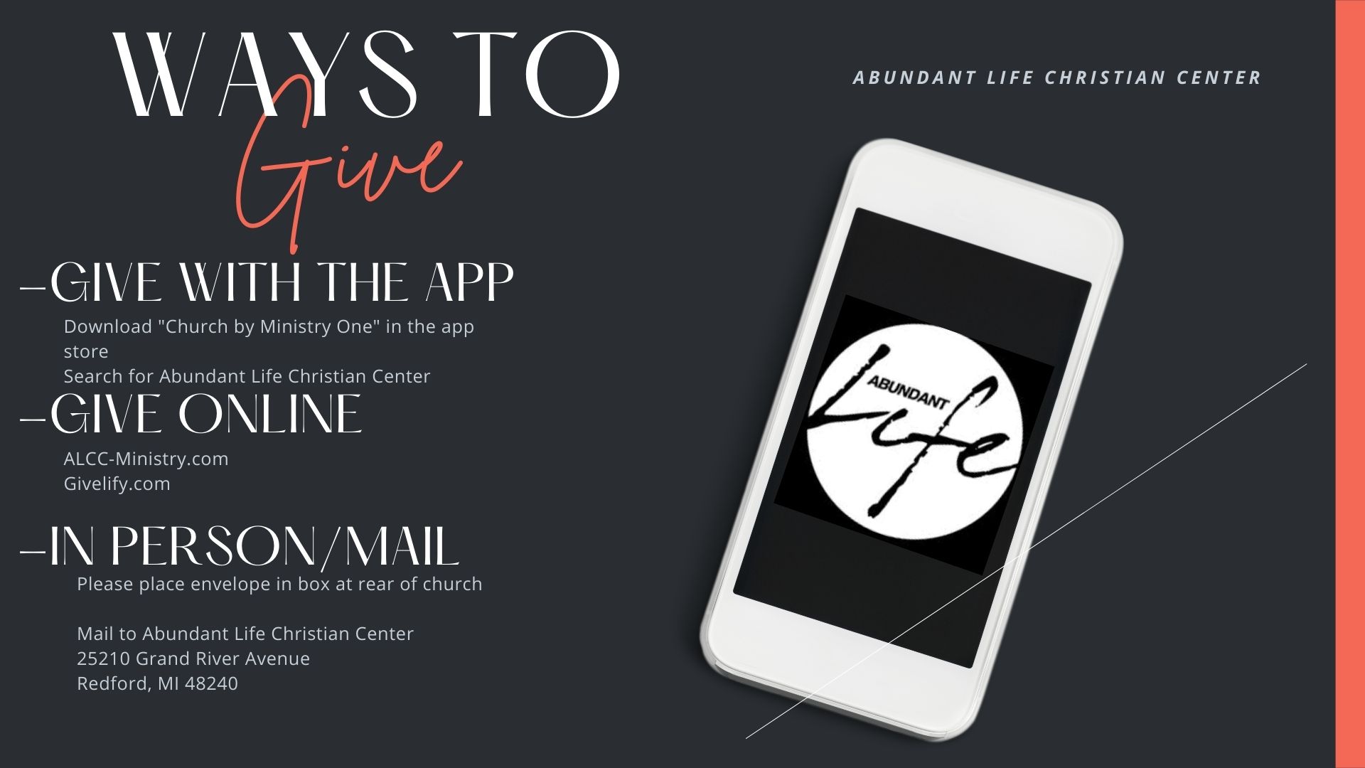 Give Online Ways to Give Ways to give Give on our app Give online: Click right here Give By Mail: Abundant Life Christian Center 25210 Grand River Ave. Redford, Mi 48240